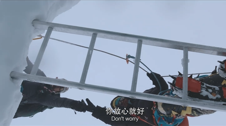 “那你怎么办?当然后面会有向导指挥我,告诉我再往里一点,或再往前一点点。但是,往里多少是没有概念的,我只能根据他的提示来试探。但是因为你试探这个脚是不能承重的,梯子就会晃,人也会晃,重心就不稳,我心里感到非常恐惧,也非常害怕。所以,虽然气温是零下二十多度,但我的后背是在冒汗的。”为了缓解压力,张洪在内心里不断与梯子、保护绳对话,祈求它们保护自己。“我没办法看见周围的风景,没办法看见周围所发生的一切,我只能用心在跟它们做交流。”张洪说,“每跨出一步,我都会感恩。每当横跨过去之后踩在雪地上时,都会有一种劫后余生的感觉,就像又跨过一道鬼门关。就是感觉,每一步都在渡劫吧。”“因为洛子壁上面最大的危险就是会掉冰块和石头,而我却看不见,根本没法躲。”张洪说,“也许是无知者无畏,我没有去关注这么多,就觉得我只要专注我脚下的每一步。后来也在想,我的运气也比较好,上天给了我很大的一个眷顾,让我在洛子壁没有遇到掉落的石头和冰块,所以相对来说还是比较顺利的。”