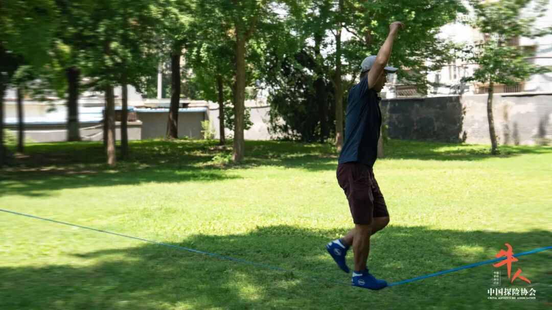 25毫米扁带的方寸之间,体验轻重缓急,掌控微妙平衡,一如人生。2024年6月12日,天坛东门地铁站旁边的一个小公园,扁带玩家张亮约了两个多年好友一起走扁带。扫了一眼周围的环境后,他看中两棵相距十几米的树,在它们之间架设好扁带。上了扁带后,他就像变了一个人,完全投入其中。每走一步,都是对平衡的调节,或快或慢间,他异常松弛与自信。
