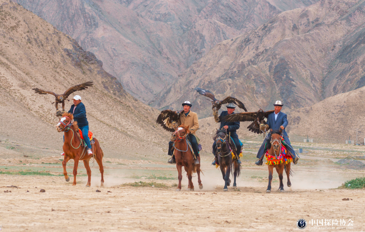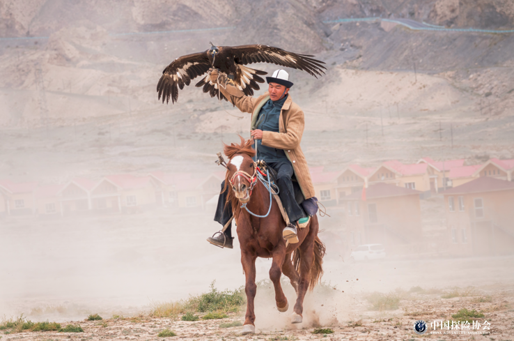 当地的猎鹰人擎着猎鹰、纵马驰骋